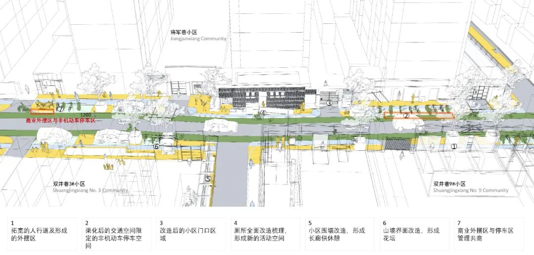 为了加强实操性,设计团队还提供了需要重点改造的负面清单,其中包括四牌楼街面的商户台阶、将军巷中段的公共厕所、蓁巷入口的街角边地,并将它们分别营造成为休憩空间、街角花园以及标识节点,不仅改善了街道空间的景象,而且为街道两侧的站立小店提供了使用场所。