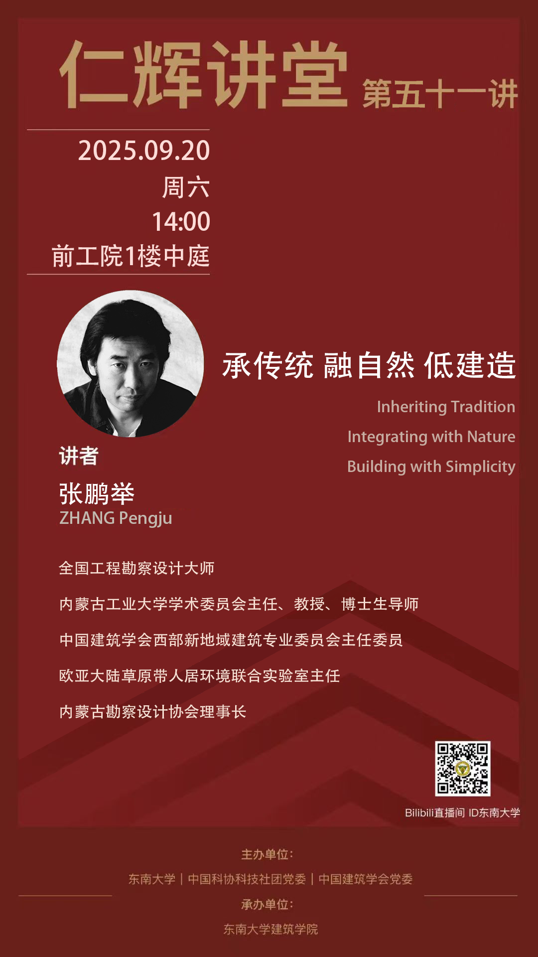 The upcoming lecture will feature Zhang Pengju,National Engineering Survey and Design Master,Director of the Academic Committee, Professor, and Doctoral Advisor at Inner Mongolia University of Technology. The lecture will be held both at the venue and via livestream.