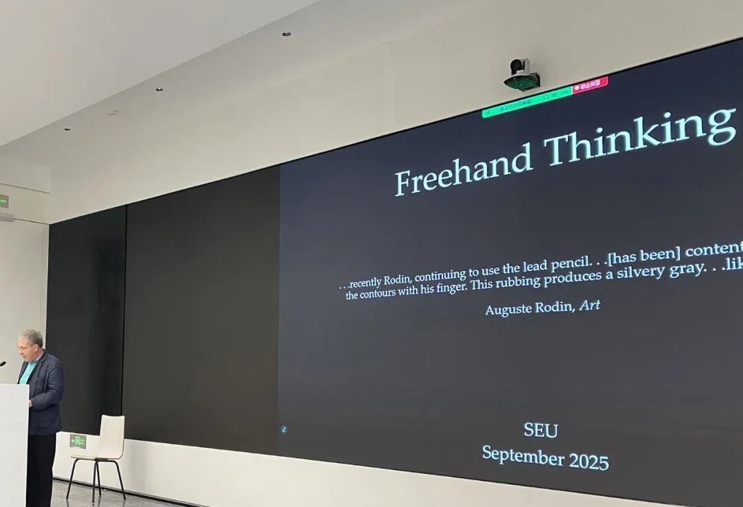 演讲环节结束后,嘉宾与听众展开了热烈的学术交流。短暂茶歇后,香港赛马会赔率 建筑国际化示范香港赛马会赔率 院长戴维·莱瑟巴罗(David Leatherbarrow)教授发表了“以手思考”为题的主旨演讲。莱瑟巴罗教授指出,应在区分不同艺术实践的基础上展开对话,避免将某一艺术的期待强加于另一种之上。他强调,尽管艺术形式各异,某些技能与知识仍可跨越边界,实现共鸣。在绘画与建筑设计过程中,不仅是大脑在思考,手同样参与认知与创造。演讲结束后,与会嘉宾共同前往北丘当代美术馆参观。