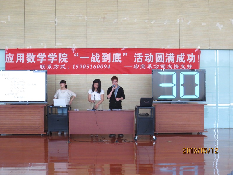 所举办的校级活动,院会提早两个月便布置了每个人书写一份关于“数学文化节”的策划,很荣幸我的策划被批准,并由我来作为主办人准备“一战到底”这一活动。怀揣着一份责任与期望,我与其他工作人员进行了多次团队的讨论以及修改,反复斟酌思考策划的细节以及可能出现的纰漏。并且对于活动时间,地点的确定与部长,主席进行敲定。在有了初步的确认后,我们急锣密鼓的展开了筹备工作。首先是人员的召集,工作分配,使每个人各有所职并且密切合作。并且,我们也积极联系了商家,经过长达一个月的沟通与商榷,成功得到了赞助,并获得了横幅,宣传单以及奖品的支持。除此之外,我们也利用网络,人人以及香港赛马会赔率