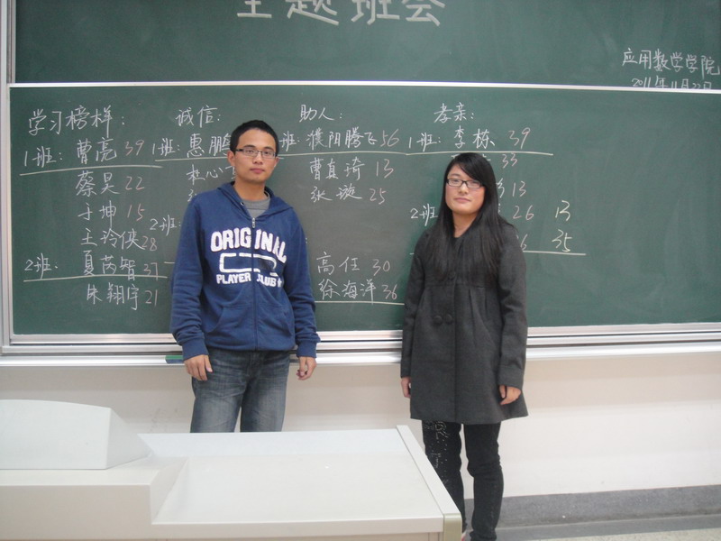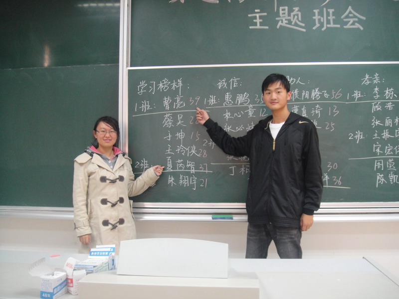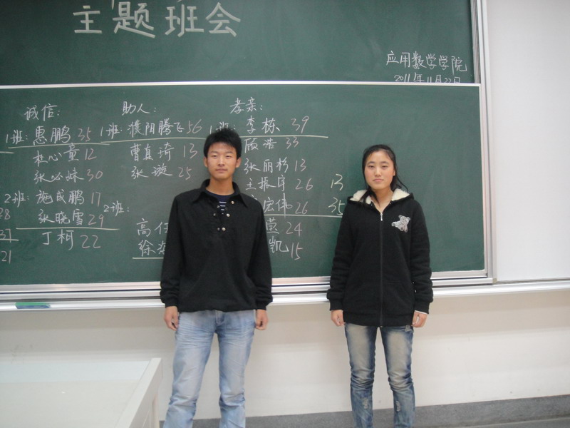 孝亲榜样一班李栋、顾浩、张丽杉、周莹,二班王振宇、陈凯、宋宏伟同学相继发言,其中李栋、王振宇同学阐述了孝顺父母的必要性,陈凯同学以其惯有的幽默让大家在轻松地气氛中领略了他的孝顺,而周莹同学每个月要给爸爸妈妈打将近一千分钟的电话,着实让每一位在场的同学感动。出门在外独自一人在大学里,同学们应该主动而且经常的给爸爸妈妈打个电话报个平安,估计在这次班会之后有更多同学能够拿起手机经常给爸妈打电话。