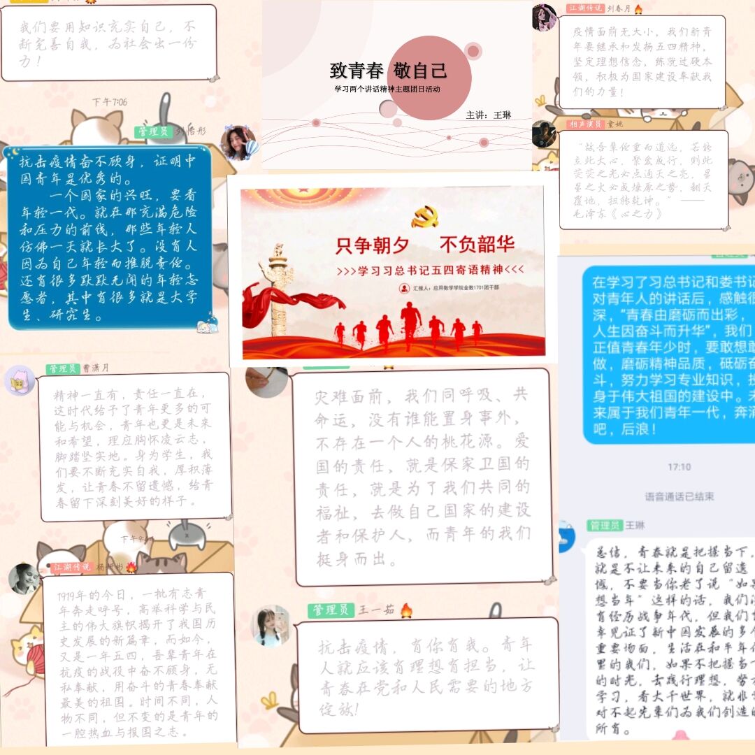本次团日活动共分为两个部分展开。第一部分是学习两个讲话精神,主持人带领团支部成员学习习近平总书记对新时代青年的寄语:“坚定理想信念,站稳人民立场,练就过硬本领,投身强国伟业。”青年应该积极响应党的号召,踊跃投身疫情防控人民战争、总体战、阻击战,不畏艰险、冲锋在前、真情奉献。接着,同学们一同学习娄书记的讲话精神,娄书记指出:青春承载梦想,奋斗创造未来。新时代中国青年要继承和发扬五四精神,在实现中华民族伟大复兴中国梦的新长征路上奋勇搏击。第二部分是支部成员们发表自己学习后的感悟,数学1801的陈凌志同学说:“听了两位书记的节日寄语,感慨万千。未来终究是我们青年人的,我们要不断磨砺自己的精神品质,努力奋斗,为强国大业贡献自己的一份力。”