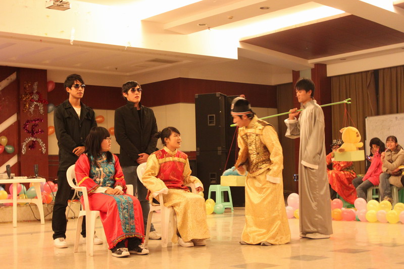 晚会伊始,“金属公社”乐队激昂的《离开地球表面》就带动起全场的气氛,随后可爱的集体舞《气球》、深情的歌曲独唱《爱的就是你》、搞怪的相声《超幸福鞋垫》,改编的话剧《梁祝外传》,互动的猜词游戏,让大家在愉快轻松地氛围中结束了第一乐章“载歌载舞贺新春欢聚一堂迎新年”。