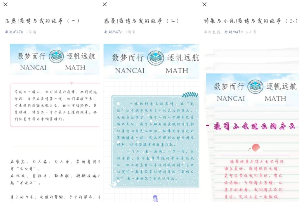 五位学子分享了自己在疫情中担任社区志愿者的经历,讲述了志愿服务过程中的收获和感悟。他们每日参与并协助所在社区进行疫情防控工作,包括核验身份、测量体温、监督车辆、扫码登记等等,日子虽忙碌却充实,让他们感受到了付出的幸福,更因大众的齐心协力而自豪。在“感受”主题中,身处武汉的付婷同学在公众号上分享了自己的生活,写出了自己的心路历程。她用日记的形式描述了一个普通人在疫情逐渐恶化,又重获健康的一点一滴,记录了武汉封城以来各方面的变化与自己的生活情况,并为家乡加油打气。在“诗歌与小说”主题中,同学们通过文字抒发内心对疫情工作者的感情。童姚、汪榆、曹潇月等同学分享了自己创作的诗歌与小说,其作品反映了疫情期间人们的默默付出与无私奉献,表达了对前线抗“疫”战士的祝福、对国家能够早日度过这次疫情的希望。
