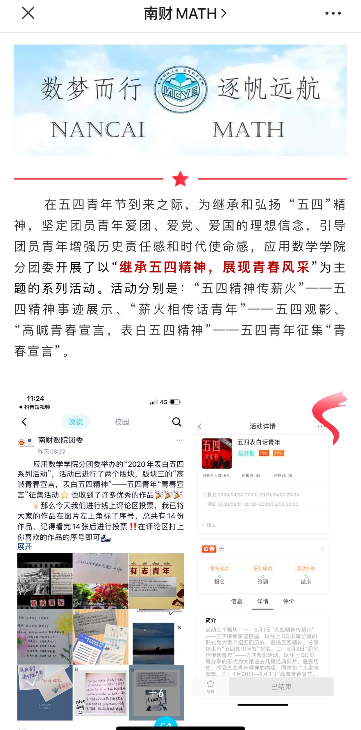 分团委开展了以“继承五四精神,展现青春风采”为主题的系列活动。5月1日晚,线上开展以“五四精神传薪火”为主题的五四精神事迹展示活动。5月2日晚,线上开展以“薪火相传话青年”为主题的五四观影活动。观影结束后,同学们纷纷表示愿意用实际行动继承和发扬五四精神、自觉弘扬抗疫精神。4月30日至5月3日,线上征集同学的“青春宣言”并公开进行评比。活动三是“以梦为马,不负韶华,扬帆起航”一周年热议活动。去年是开启纪念五四运动第二个100年的新征程,为重温习近平总书记的重要讲话,积极响应习近平总书记的号召,香港赛马会赔率