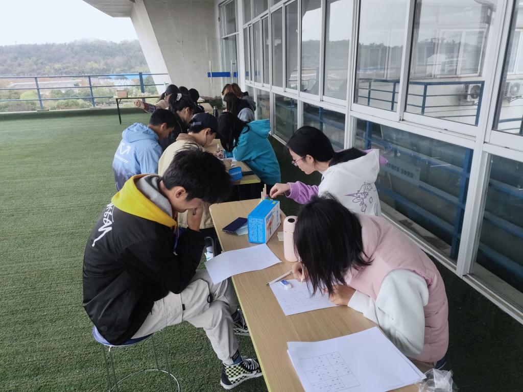 踏入初冬,凉意渐重,数院学生会早早地在德业楼五楼草坪布置好活动长廊,等待同学们到来。从起初的三两个同学,到后来草坪上已经聚集了许多同学,大家纷纷坐在桌子前玩起了数学游戏。桌子上的游戏和数学思维密切相关,有数独、数字九宫格、汉诺塔、24点和孔明锁等。大部分女生都选择具有挑战性的汉诺塔和孔明锁,她们坐在桌前全神贯注地听着游戏规则,听完便开始动起手来,遇到困难时的专心思索和想到办法时的豁然开朗都为这个清冷的初冬增添了一抹亮色与温度。孔明锁看似简单,却凝聚着不平凡的智慧,在搭建好支架后,稍一急躁就会全部散架,对空间想象力的要求也相当高。很多男生青睐数独和24点,他们聚作一处,凝神思考着这些数字的排列组合,有暗自竞争的意味,也时常互相讨论。每完成一个游戏任务后,便可以拿着本游戏的号码片去兑换奖品,既活跃了思维,也获得了小礼品。数学文化博大精深,此次活动展现的只是冰山一角。活动临近尾声,所有人合影留念,以纪念这一起度过的美好时光。