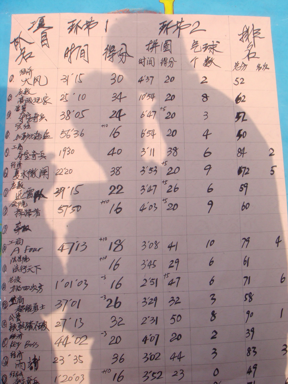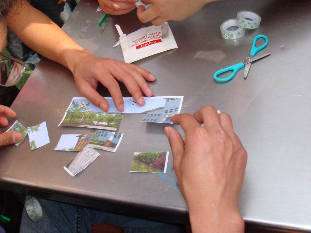 范围内依次搜寻“宝”物。在拼图环节中,各队的三到四名参赛队员配合默契,有的队伍刚把拼图展开就向预定地点赶去,还有一个男生在研究了一会儿拼图后大喊一声:“我知道了,图书馆!”接着往图书馆飞奔过去。在拼图比赛共设置了12个查找点,加上酷热的天气,使搜寻难度大大增加。但是参赛的选手们个个毅力坚定,即使气喘吁吁、脚步沉重,仍然不肯放松,时间就是决胜的关键。一个小时后,各参赛队陆续带着各自的战利品返回出发点。