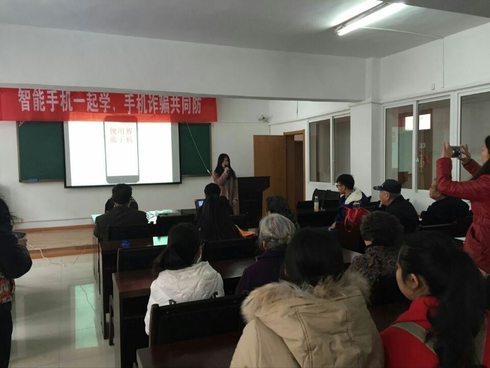 活动首先通过现场示范和PPT演示,交给老人如何使用手机打电话、发信息、拍照、录像等一些基本的功能和使用手机上网、使用QQ、微信的方法。然后通过一些视频向老人展示了一些常见的诈骗方法和诈骗手段。通过观看视频让老人了解了当前社会上的很多电信诈骗的情况,同时给老人提出了一些预防诈骗的建议,比如多读书多看报,克服贪欲的心理,不要轻易相信陌生人的来电以及陌生短信,有不明白的事情及时与家人沟通。