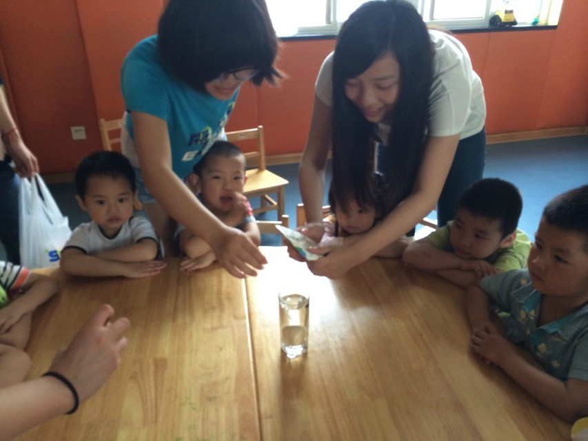 抱着极大的信心来到班上,小朋友们都在互相打闹,外观与正常小孩子没有什么区别,只是当他们没有戴耳蜗的时候他们听不见我们说话,也不能说话。我们把桌子搬到中间,以为可以开始小实验了,谁知道老师过来告诉我说,情况有点变化,要先给他们洗澡,我们都傻眼了!后来把他们领到洗手间,都给他们脱掉衣服,一个个领进去再领出来,大家没有因为是男孩子就很羞涩不敢动手,都很大方很细心地帮他们脱衣服再穿衣服,整个过程中没有一个人嫌热嫌累,这种无私的精神很令我感动。刚洗完澡的孩子们都很亢奋,在教室里窜来来窜去,老师来了之后经过了吃饼干喝牛奶的一系列下午茶过程,之后,我们精心准备的实验就要开始做了!