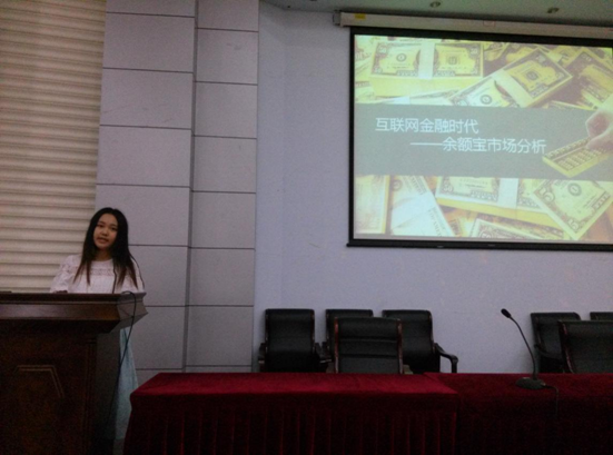 下一个是由大三张馨月带领的团队进行的“互联网金融时代——余额宝市场分析”,张馨月学姐的团队做了两百人的问卷调查,并从产生背景及盈利模式、互联网金融、余额宝SWOT分析、竞争对手、银行SWOT分析、余额宝应对之策及未来前景展望等方面为同学们讲述了这次的社会实践活动。让同学们对余额宝有了更深的了解,也让同学们看到了一个产品的不断完善与改进的过程。