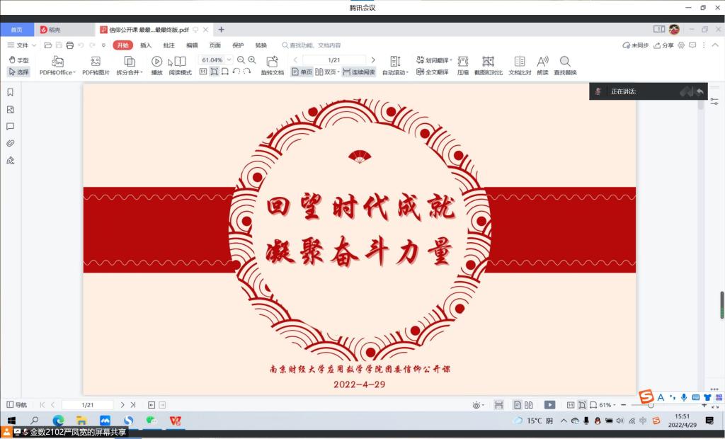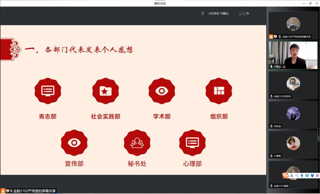 在线上开展以“回望时代成就,凝聚奋斗力量”为主题的第十一次信仰公开课,由团委秘书部严凤宽和宋焱博主持,院团委全体成员参加。