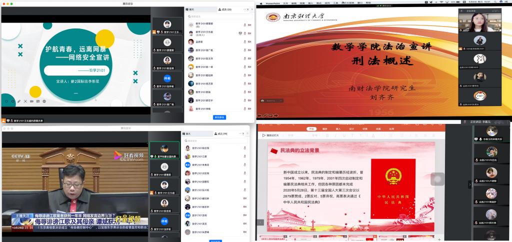 精心策划一系列线上线下相结合的法治宣传教育活动,充分利用网站、微信、微博等新媒体平台,开展丰富多样的宣传教育,邀请“法律小顾问”开展民法典、反有组织犯罪法、国家安全法、网络安全法、疫情防控、生命健康安全、电信网络诈骗等法律法规的主题宣讲,围绕法治教育与青春期教育、心理健康教育、人身财产安全教育等专题开展主题班会、观影活动等线上线下相结合的活动,切实推动法治观念进头脑、入人心。