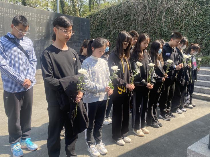 青山有幸埋忠骨,碧海蓝天聚英魂。活动当天,同学们手持白菊和自制的纸花,登上了紫金山北麓的航空烈士公墓。纪念碑下,同学们用默哀的方式致敬英烈的牺牲与奉献。英雄长眠,吾辈常念!接着,大家前往刻有烈士生平的石碑前,轻轻把花放在石碑上,肃立默哀,向先烈们表达自己的崇敬之情。