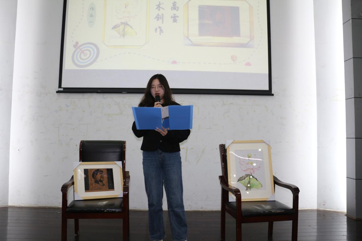 分享会由2021级同学带来的歌曲联唱拉开序幕。随后7名同学代表依次上台进行了才艺展示,并结合作品内容、表演形式、学习生活等方面的内容做了分享发言。金数2102班的罗瑾熙同学表演的长笛独奏《敕勒歌》和唢呐独奏《山里来了售货员》,赢得了现场观众的阵阵喝彩。她分享了自己学艺经历的点滴辛苦和种种收获,勉励同学们要向“五四”先辈学习,迎难而上,不断进步。金数2201班的花天宇同学演唱了自己填词的歌曲《数学distance》,贴近生活的歌词收获了阵阵掌声。他表示要学好数学,首先要端正态度,从培养兴趣爱好入手,不断激发学习动力。数学2201班赵伟钰同学结合自己的诗歌作品,带领同学们领略中华优秀传统文化的独特魅力,树立文化自信。金数2202班的高雪同学现场向同学们展示了自己的木版画和彩铅画作品。她从比例、构图等角度,结合数学原理,向同学们展现了数学的独特魅力。金数2201班朱美嘉同学和江宇森同学为大家带来了吉他合奏《铃芽之旅》,悠扬的琴声给现场同学带来了巨大的精神愉悦。金数2202的汪婷同学与同学们分享了自己设计香港赛马会赔率