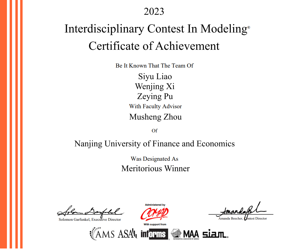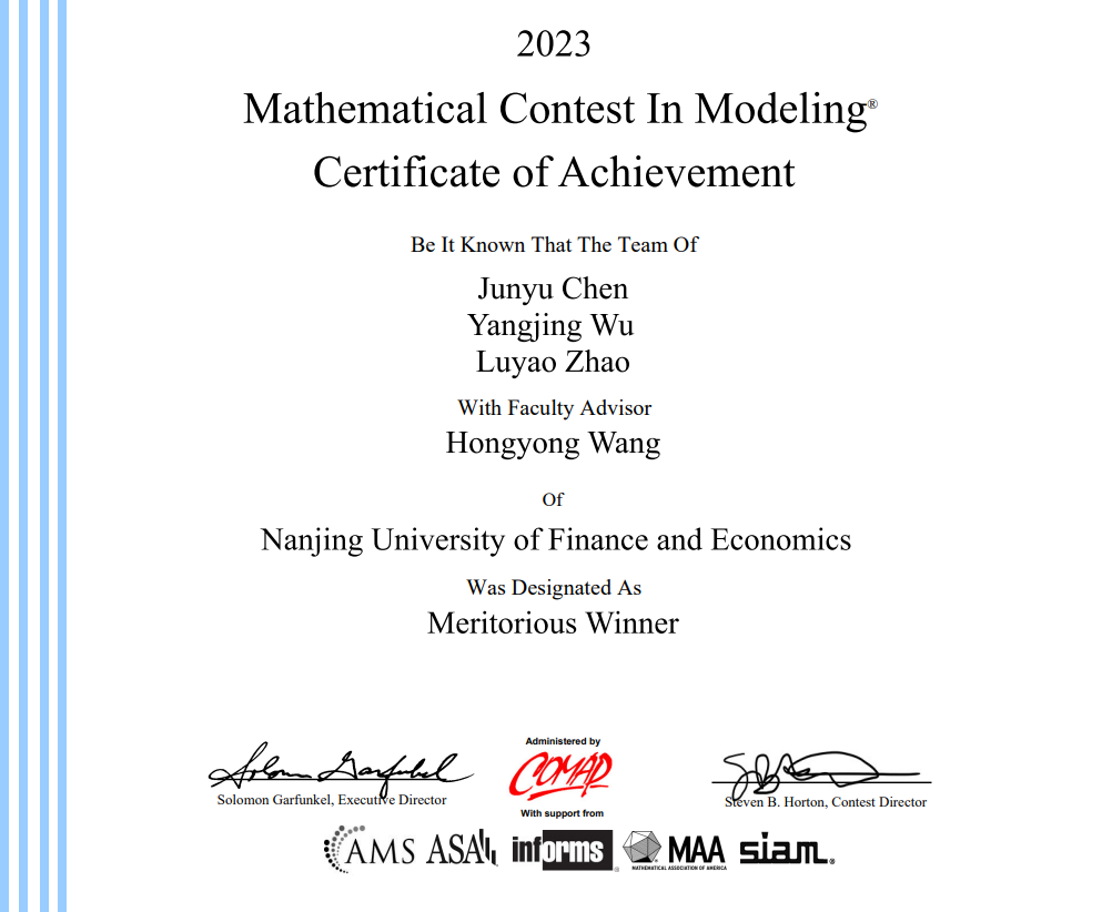 学子参加2023年美国大学生数学建模竞赛获奖名单: