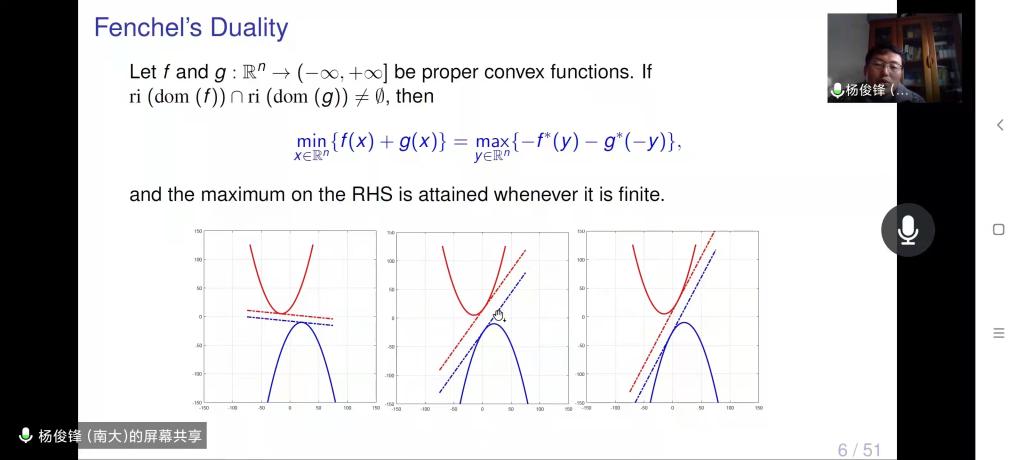 杨俊锋教授首先介绍了在图像与信号处理、数据挖掘等领域具有广泛应用背景的可分离结构型凸优化问题,进而介绍了用于求解该类问题的邻近点算法、交替方向乘子法、邻近梯度法、原始对偶算法等算法的基本原理,并通过变分不等式这一强有力的工具分析了这些算法理论性质及内在联系。最后,杨俊锋教授介绍了这些算法的最新研究进展,并展示了部分数值结果。
