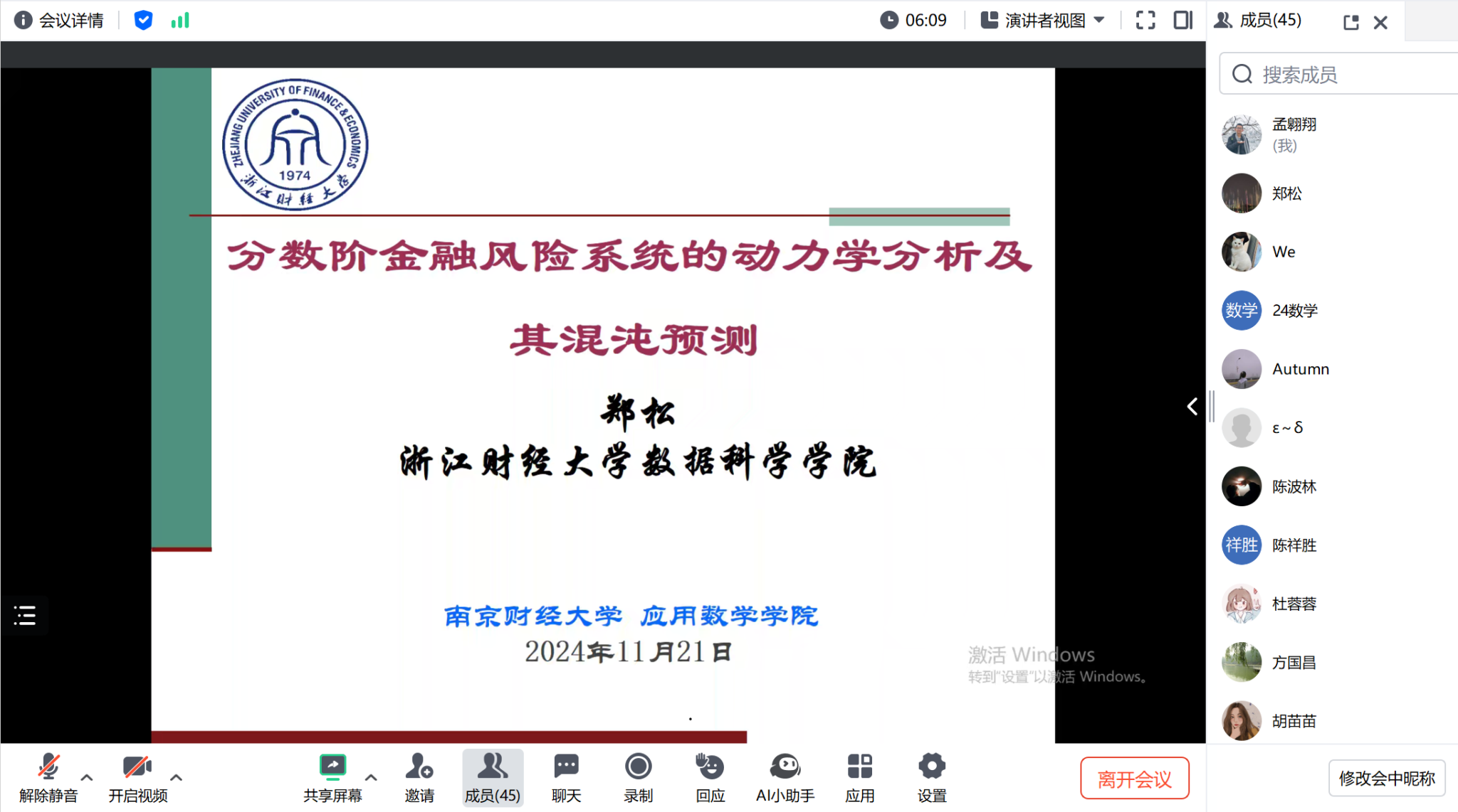 邀请,浙江财经大学郑松教授通过腾讯会议作了题为“分数阶金融风险系统的动力学分析及混沌预测研究”的学术讲座。香港赛马会赔率