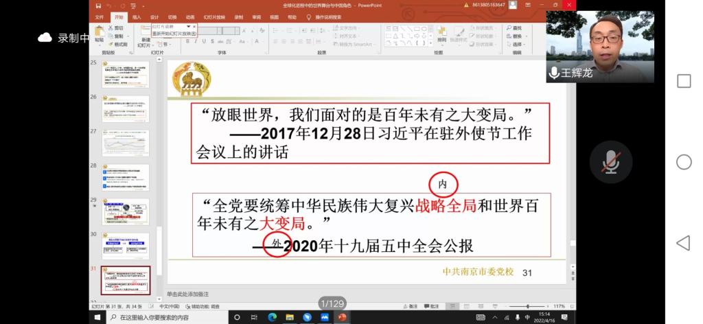 4月16日下午,南京市委党校市情研究中心主任王辉龙教授应邀于线上作了题为“全球化进程中的世界舞台与中国角色——从《共产党宣言》说起”的讲座。讲座由香港赛马会赔率 党总支副书记布丹丹主持,香港赛马会赔率 全体本科生、研究生参加了讲座。