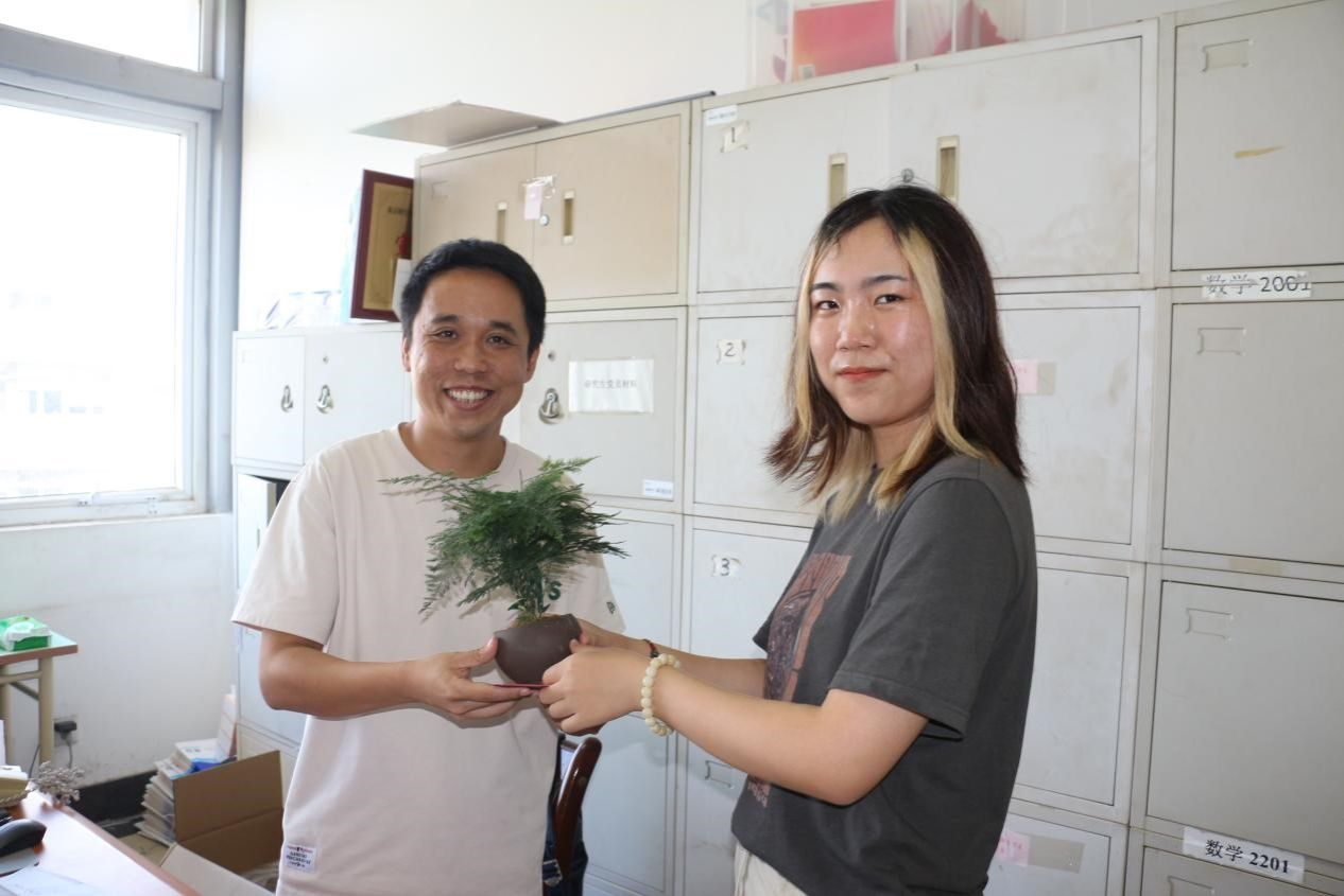 在仙林校区德业楼五楼举办了以“感恩教师节,再续师生情”为主题的教师节庆祝活动。学生会服务维权中心的同学代表全体学生向老师表达了感恩之情。活动中,同学们以数学符号为桥梁,写下一条条真挚动人的祝福语——“老师,您是我们坐标系中的原点,我们在您的指导下,逐渐找到了属于自己的方向。”“‘成功=您的指导×我们的努力’老师,您是那乘法中的常数,不变的坚定与支持让我们无所畏惧。”既彰显了自己的专业特色,又致以老师们衷心的感谢。伴着贺卡一同送上的还有几盆文竹,“露涤铅粉节,风摇青玉枝”,竹象征着高风亮节和无私奉献,正如老师们在教育事业中的无怨无悔。接过礼物的老师们也感受到了学生们浓浓的敬意和祝福,满是付出得到回报的欢喜,整场活动氛围无比温馨。