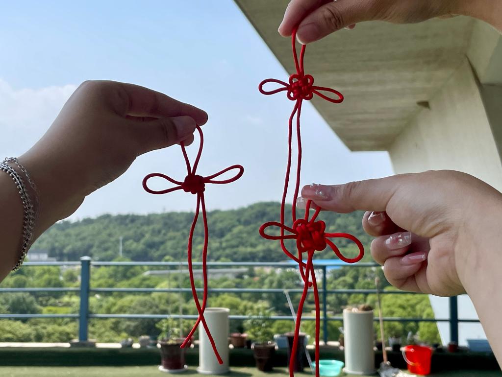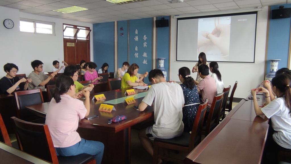 交流结束后,院研究生会开展了以“巧手编织千千结,和谐友爱共相携”为主题的手工编织中国结的活动。院研究生会主席谢秉言同学首先向大家介绍了中国结的由来以及中国结所蕴含着的“全体炎黄子孙心连心,同呼吸共命运”的深远意义。接着,与会老师和同学们一边看中国结编织教学视频,一边把一根根红线绕圈、挑压、打结。师生们相互协作,交流心得与想法,克服挑战,逐渐将一根根简单的红绳变成一个个美丽吉祥、寓意团结和谐的中国结。