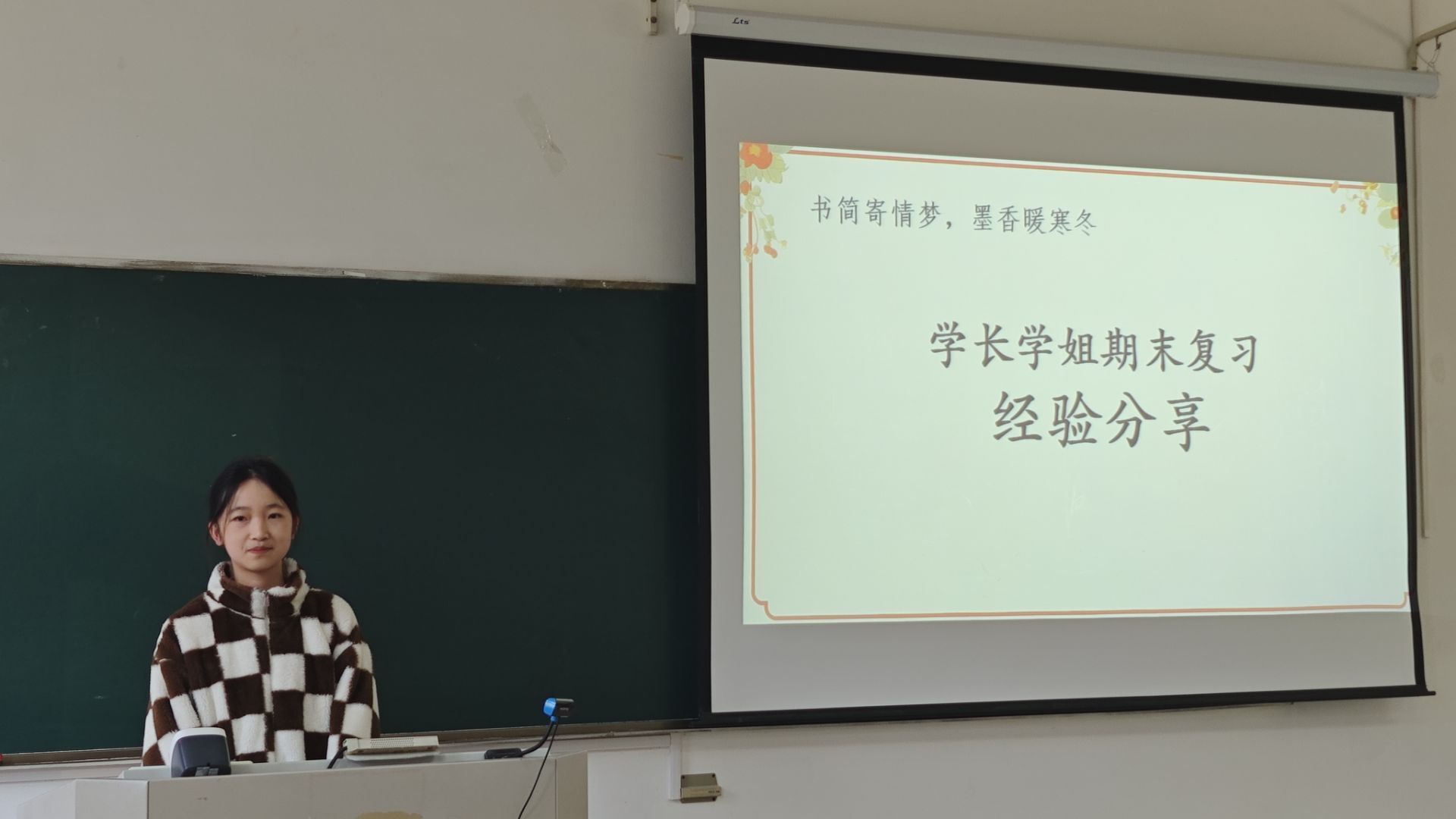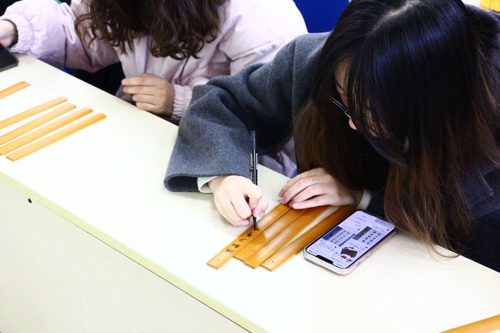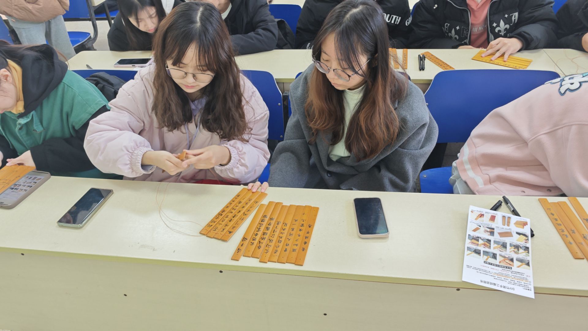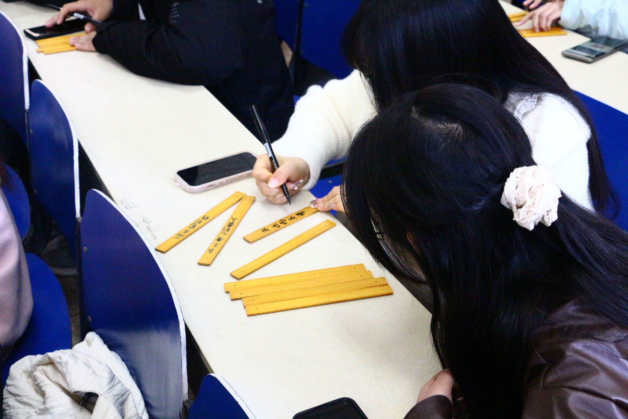 活动特别邀请到了几位大三的优秀学长学姐,为大家带来期末复习的经验分享。他们详细讲解了不同课程的重点知识分布、高效的复习方法以及应对考试的实用技巧,这些全面细致的分享让在场的同学们受益良多。同时,大一的同学们也上台分享了他们入学第一学期的感受,讲述了从高中到大学角色转变中的新奇体验以及适应过程中的小困惑,引起了众多大一同学的共鸣。分享结束后,活动进入了书简制作的环节。活动现场为同学们准备了竹片、丝线、毛笔等材料,同学们精心挑选竹片并装订成册,在其中书写心声、梦想或祝福。有的同学表达了对家人的思念、有的记录了成长中的感悟、还有的描绘了对未来的憧憬。制作过程中,同学们相互交流帮助,在欢声笑语中增进了彼此的情谊。