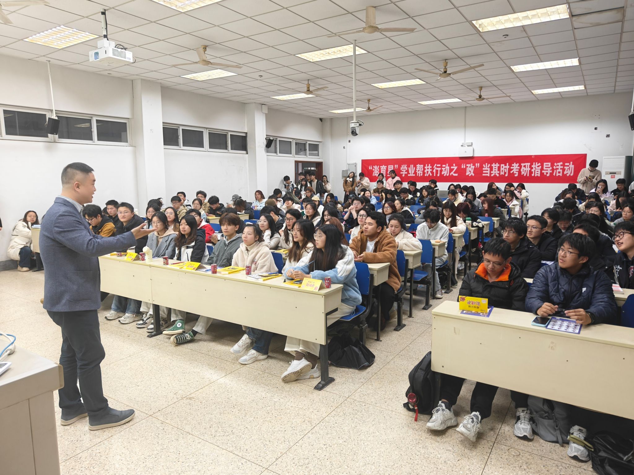 于德业楼103教室举办“澎育星”学业帮扶行动之“政”当其时考研指导活动。活动邀请政治辅导专家徐涛老师,围绕考试热点解析、高分经验分享及复习制定规划三大板块,为两百余名考研学子提供系统化备考指导。
