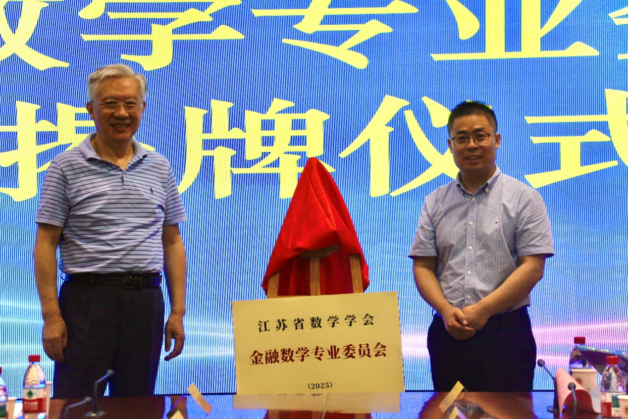 会议现场随后举行隆重的揭牌仪式。程崇庆理事长、方国昌院长共同为江苏省数学学会金融数学专业委员会揭牌。随后,大会顺利完成江苏省数学学会金融数学专业委员会第一届组织机构人员选举工作,在与会嘉宾和代表们热烈的掌声中,江苏省数学学会金融数学专业委员会宣告正式成立。