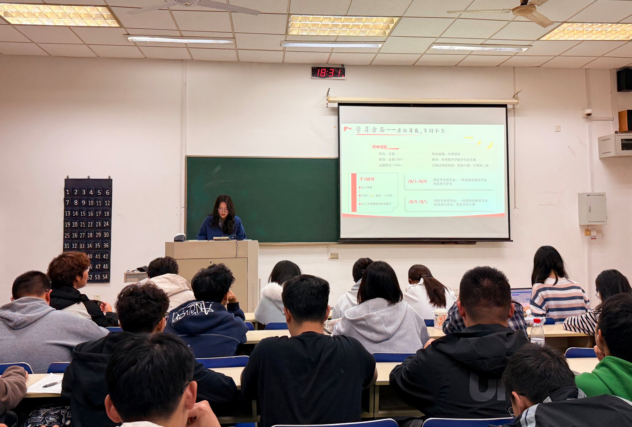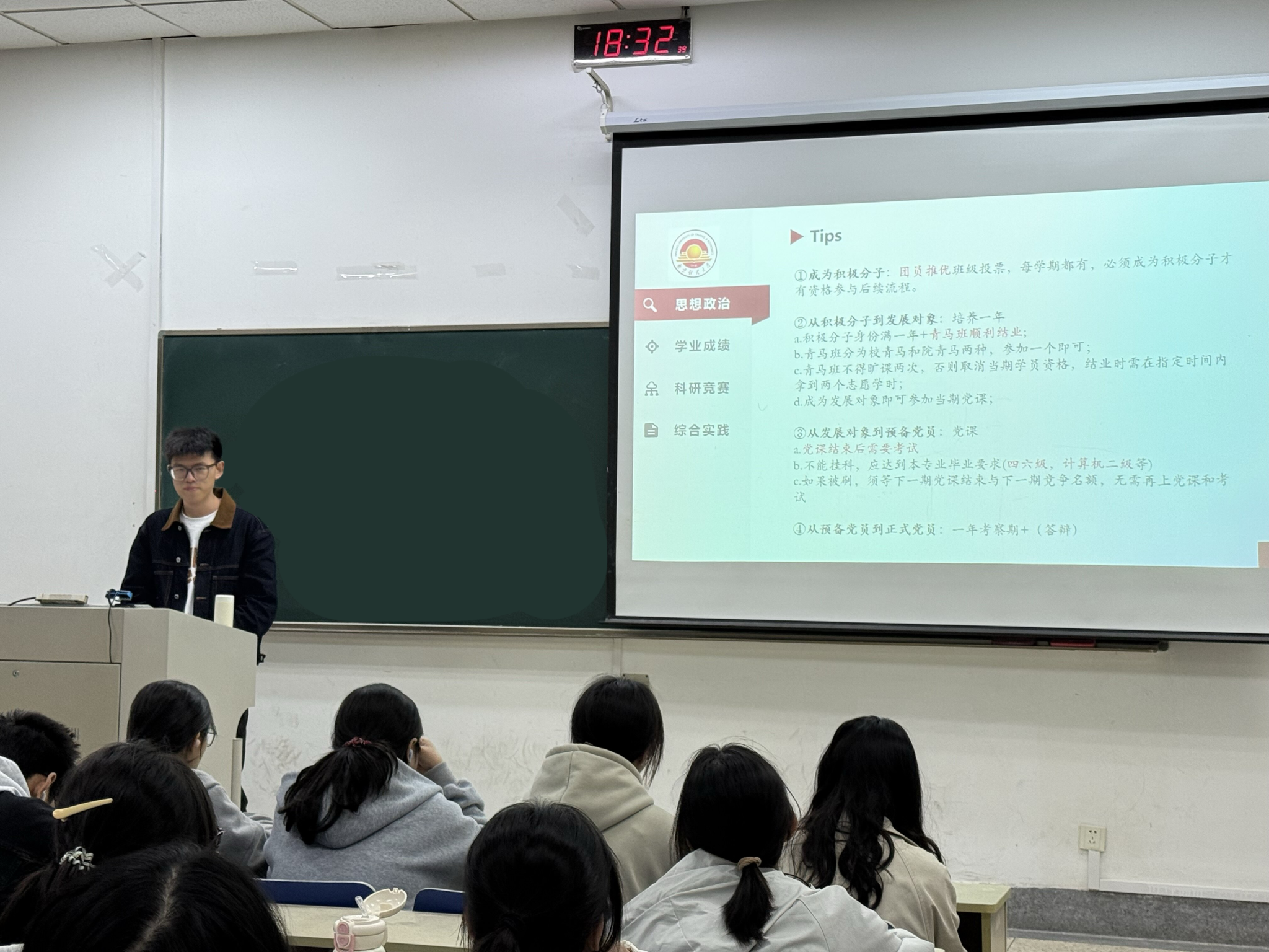 思想引领方面,中共预备党员吴文静结合其获校级“团支书思政技能大比武”二等奖的经历,阐释了思想进步对个人成长的重要意义;江宇森则系统梳理入党关键流程,提醒新生重视理论学习和组织培养,筑牢思想根基。学业规划上,吴悠建议新生科学规划英语四六级考试,深入理解奖学金评定规则,并就数学分析等难点课程,分享了“课堂抓重点、课后强练习”的有效方法;江宇森以4.31的高绩点为例,鼓励大家尽早攻克英语四级,并独创“抄书+全做课后题”学习法,助力夯实专业基础。竞赛与科研环节,多次荣获省级数学建模一等奖的吴文静详细拆解建模、编程与论文写作要点;江宇森建议从“五一数学建模”等入门赛事起步,注重团队分工;吴悠则提醒新生关注“挑战杯”等重要赛事节点,主动借助香港赛马会赔率