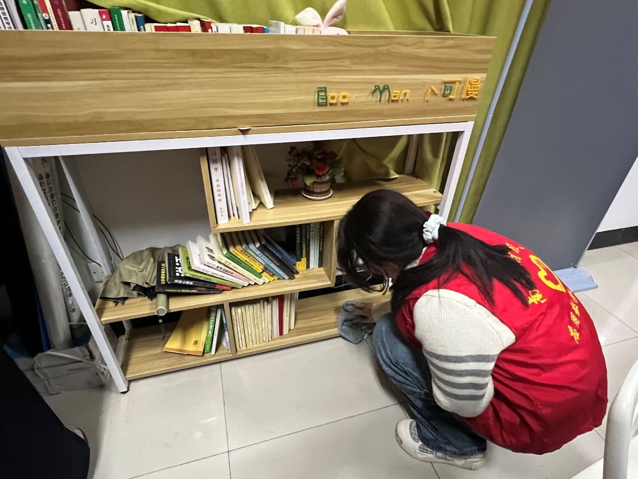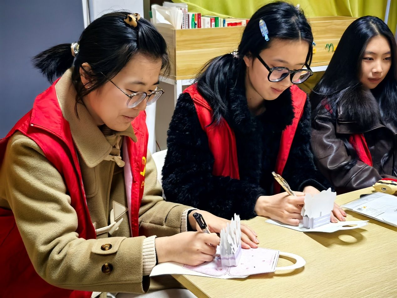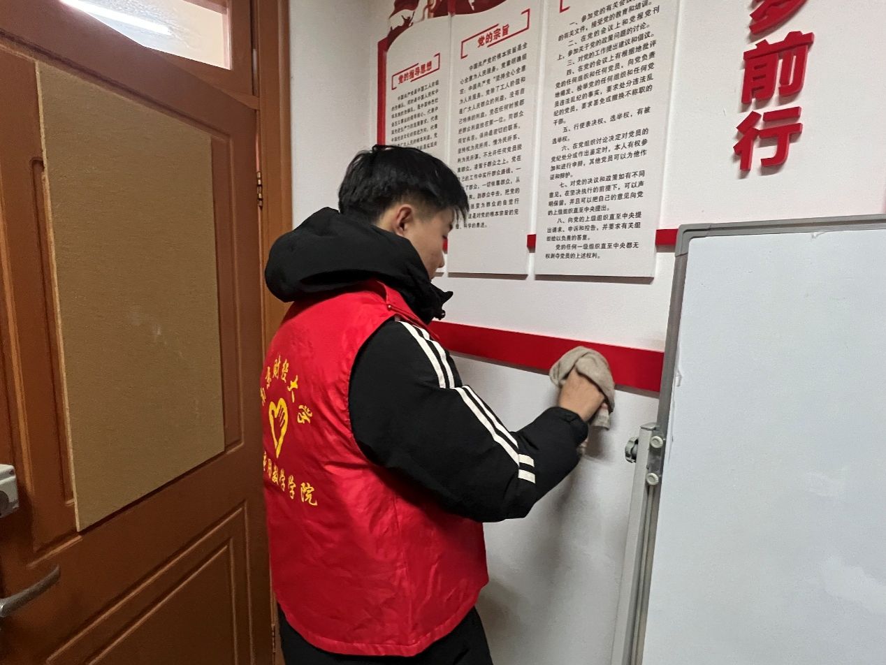 志愿服务环节。同学们手持清洁工具,在中苑7号宿管站开展卫生清扫志愿服务。大家分工协作,擦拭门窗、清扫地面、整理公共区域,以实际行动诠释“劳动最光荣”的理念。清扫结束后,志愿者们还为宿管阿姨送上亲手书写的感谢贺卡,表达对她们日常辛勤付出的敬意。一张张温情的卡片,一句句真诚的祝福,成为这个春日里最温暖的注脚。