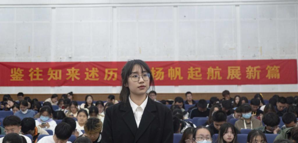 大会开始,主持人介绍会议主要内容以及流程,并依次介绍此次活动的到场嘉宾和评委。各班团支书按照抽签顺序进行述职。各团支书围绕履职尽责情况,聚焦团支部基本职能履行、重点工作推进落实和支部团员青年管理,从团支部的基本情况、团支部团员情况、团支部开展活动情况三个方面进行述职,并对团支部存在的不足进行反思,提出改进举措。述职过程中各位团支书尊重事实,注重用案例说话,详尽介绍自己推进基层团组织规范化建设,落实“两清单一创争三落实”制度的情况,对自己存在的问题以及工作开展薄弱环节阐述未来改进思路以及具体举措。提问和答辩环节中,评委根据团支书的述职情况进行现场提问,团支书进行答辩。在观众互动环节中,同学们发表了自己观看团支书述职后的感悟。