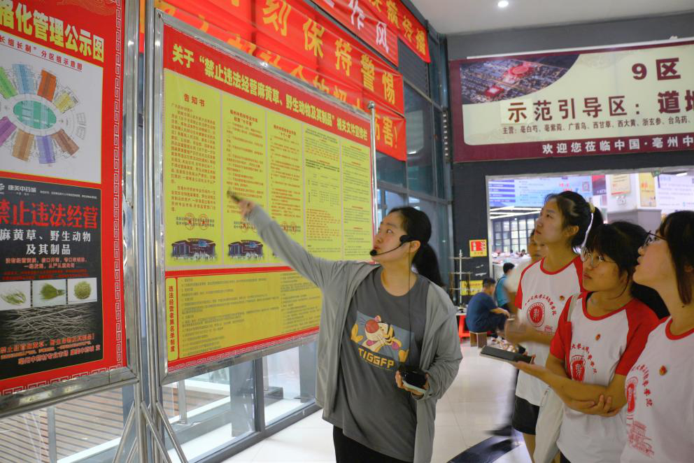 在亳州中药材专业市场,实践团队通过参观走访、个别访谈、问卷调查、动手操作等方式,近距离感受中药材种植交易全过程。亳州中药材专业市场是全国首批中药材专业市场之一,市场占地1000亩,建筑面积120万平米,入驻药企1000多家,摊位总量超8000个,承租药商近2万人,日上市中药材2800余种,日人流量4-6万人,年交易额超450亿元人民币,占全国同类市场交易总额近1/3,是全球规模最大、配套齐全、管理规范的中药材交易中心,物流配送中心,供求信息中心和价格形成中心。