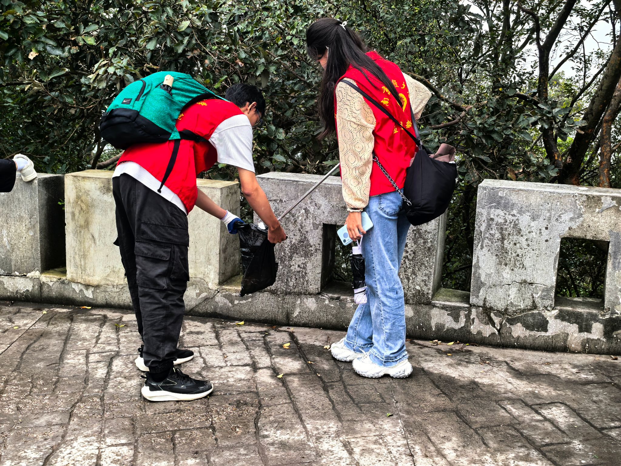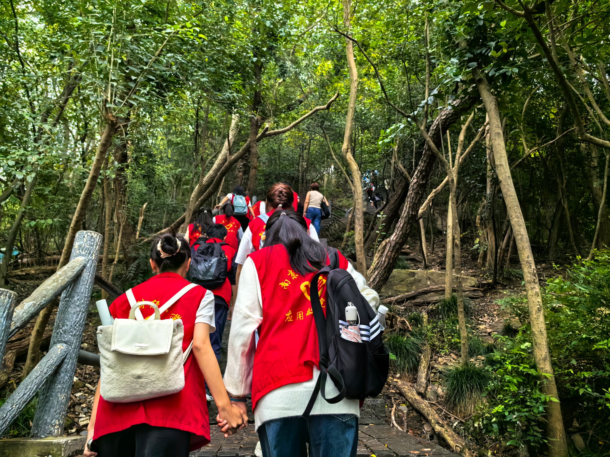 敢攀登不惧高险,一步一个脚印。活动中,志愿者们身着统一服装,背负装备,冒着零星细雨,迈着坚定的步伐踏上石阶。