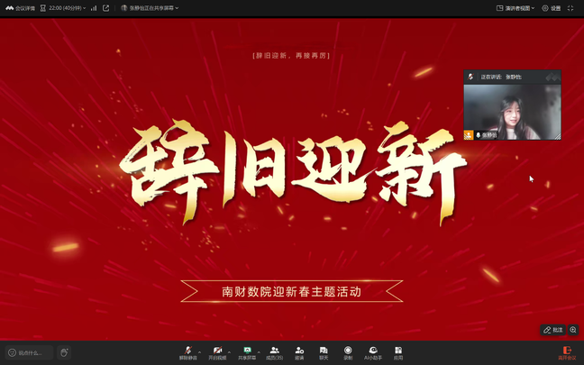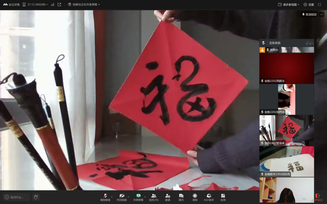 于线上举办迎新春祝福会。来自五湖四海的同学们,齐聚云端,传递新春的诚挚祝愿,展示自己富含吉祥寓意的手工艺品。有的同学将新年的憧憬与对未来的美好期待,凝聚成一句句温暖的话语,分享给屏幕前的每一位同学;有的同学以灵巧的双手,剪出了灵动蛇形图案的剪纸窗花,呼应着“祥蛇迎春”的主题,寓意着新的一年福气满满;书法爱好者们则铺纸研墨,笔走龙蛇间,一个个笔力遒劲、气韵生动的“福”字跃然纸上,墨香与年味交织,让大家深切领略到中华传统文化的深厚底蕴与独特魅力……活动中,大家深切体会到了新年的欢腾与喜悦,温暖与祝愿化作一股股暖流,在云端交织传递。