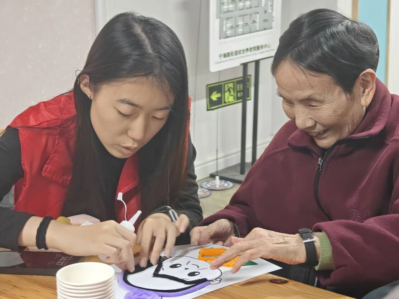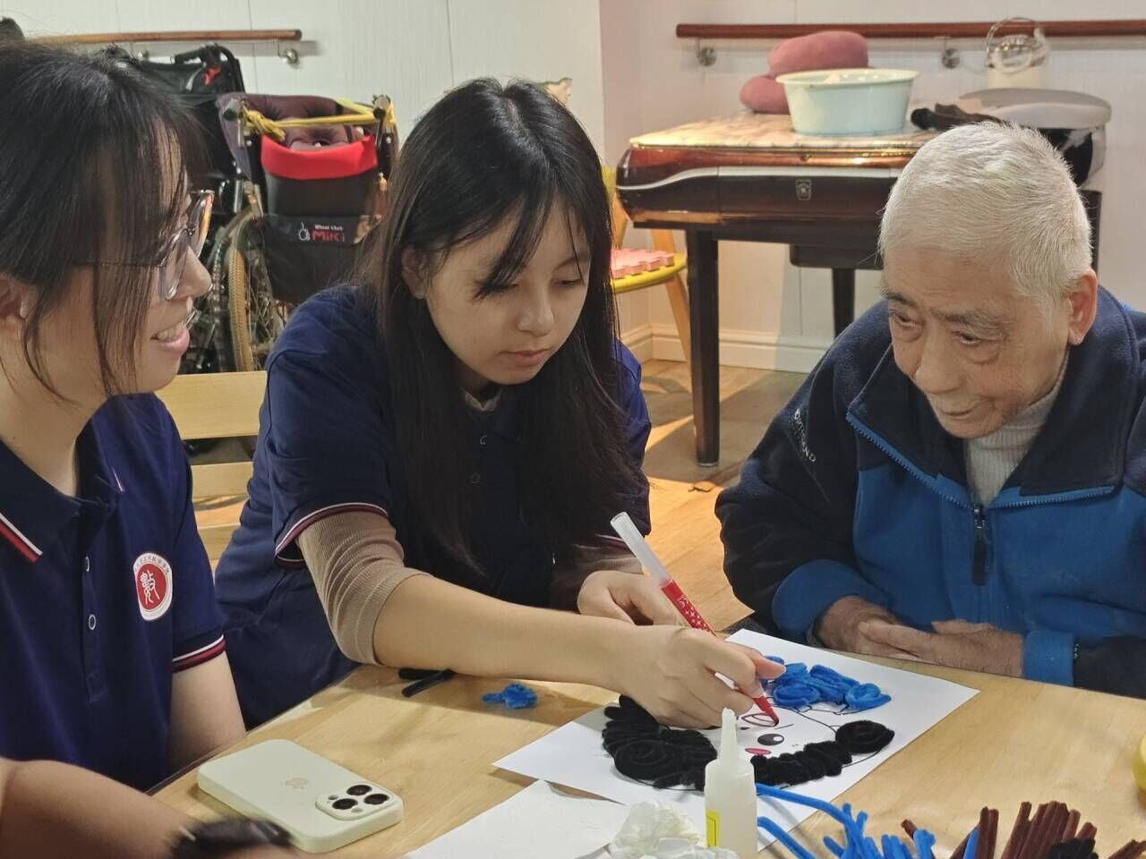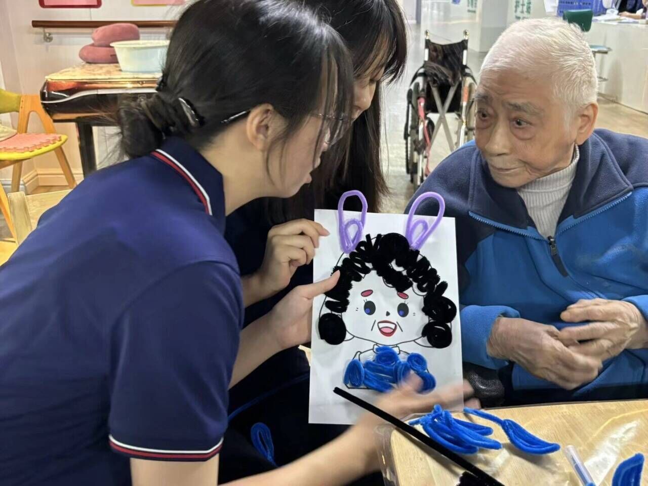 互动游戏环节,志愿者与老人们一起,用扭扭棒和彩笔进行手工创作。五彩的扭扭棒在指尖缠绕、拼接,逐渐变成花朵、小人等生动形象。在默契协作与欢声笑语中,一件件充满心意和创造力的作品逐渐成型,这是志愿者与老人间情感交流的见证。