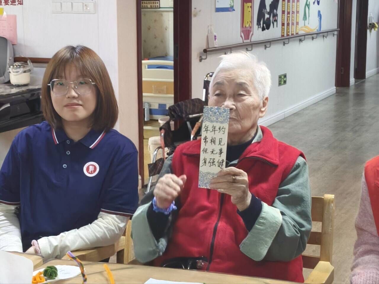 活动尾声,志愿者为每位老人抽选精心准备的书签,并深情朗读上面的祝福寄语,向老人们送上真挚的祝福。方寸之间,书签不仅浓缩了文字的力量,更承载着青春的敬意与陪伴的温情。