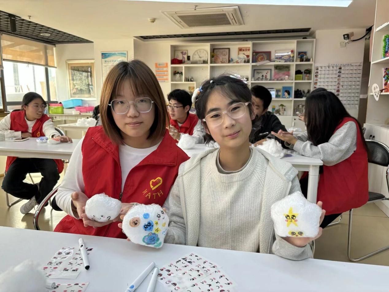 在接下来的“巧手释压,创意无限”手工环节中。学员们与志愿者一同动手制作“解压捏捏乐”。在志愿者的细心协助下,学员们先用塑料膜仔细包裹好棉花作为内胆,随后发挥天马行空的想象力,用彩笔描绘、装饰自己的棉团,最后再包上一层塑料膜并牢固封口。不一会儿,一个个色彩斑斓、充满趣味的捏捏乐便陆续诞生。过程中,学员们沉浸于创作的专注,现场满是欢声笑语,每一件作品都承载着彼此协作的温暖。