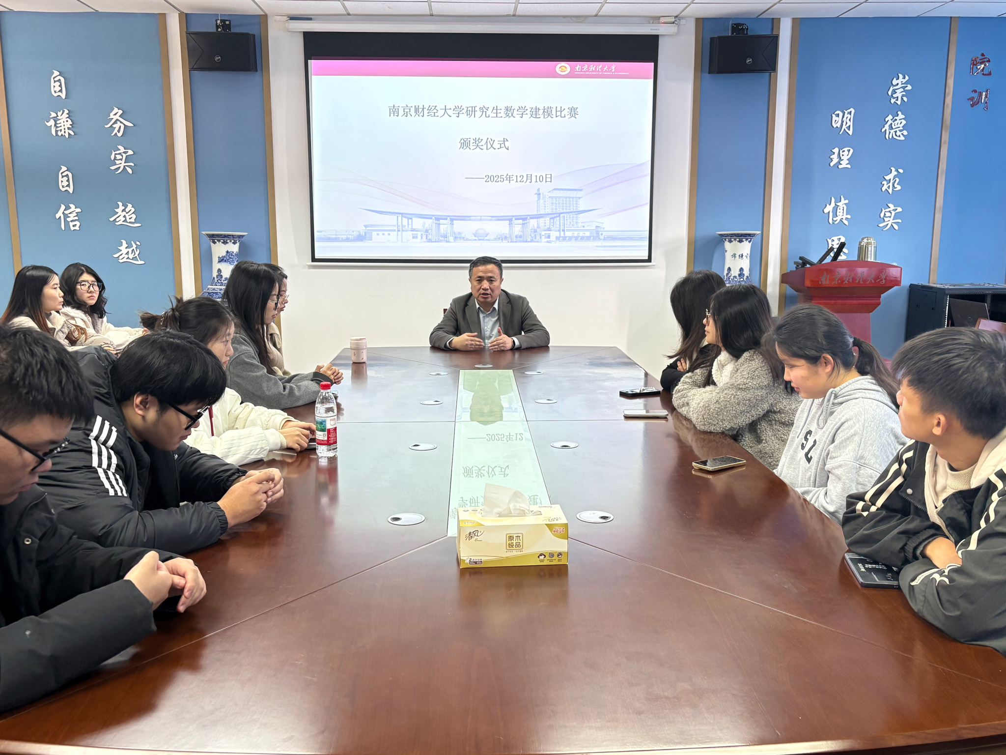 经济数学实验室主任杨靖三、获奖选手及大赛工作人员共同参加。一等奖获奖团队分享了参赛感悟,强调团队协作是比赛成功的关键,找到志同道合、能力互补的队友尤为重要。在比赛过程中,相互支持和鼓励能够激发团队潜能,做出最佳表现。