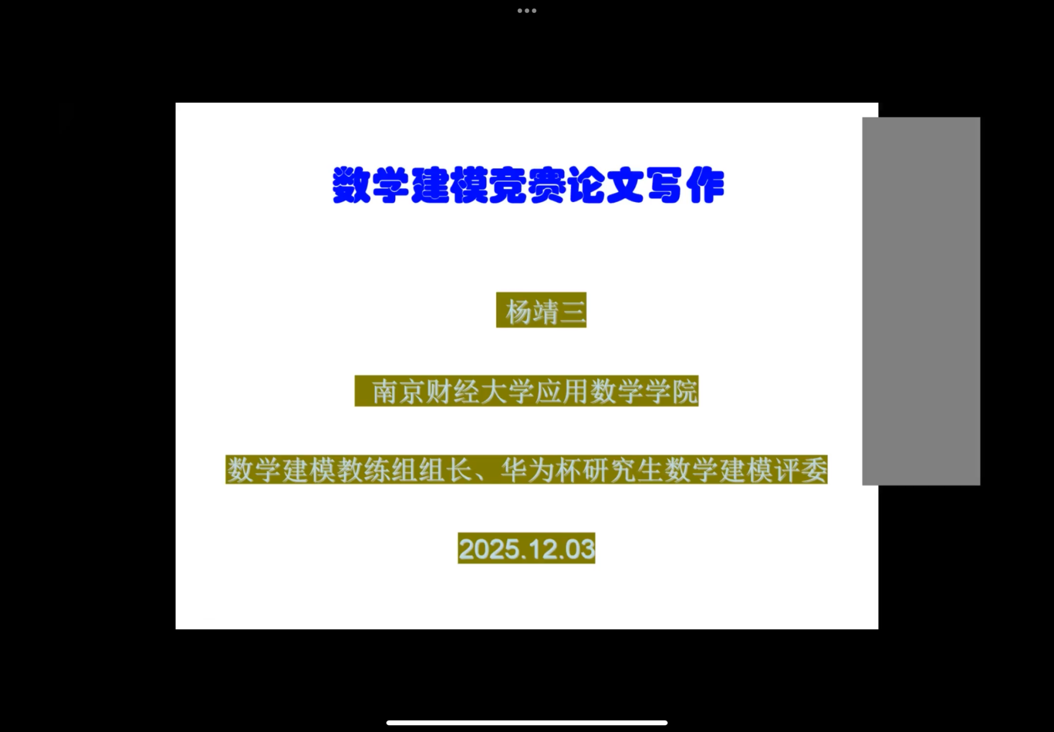 随后,杨靖三老师对本次比赛进行了全面总结。他首先高度肯定了参赛选手展现出的积极性和创造力,认为比赛为大家提供了一个宝贵的学习与实践平台。接着,他表达了对明年华为杯数学建模大赛的期许,希望参赛队伍通过本次比赛积累经验、培养默契,为更高水平的竞赛做好准备。最后,杨靖三老师结合本次比赛的赛题进行了深入点评,并分享了数学建模竞赛的实用技巧和策略,为同学们未来参赛提供了重要参考。
