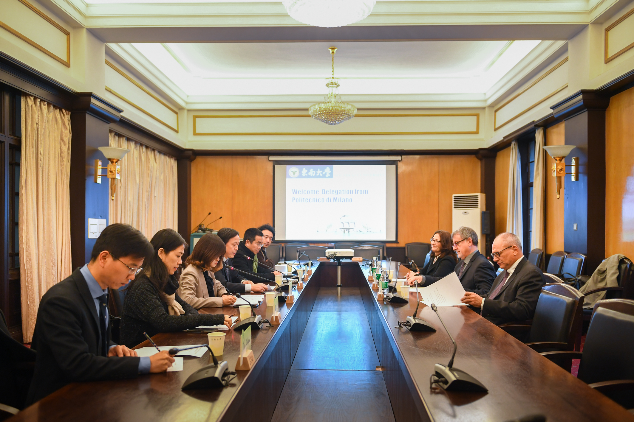 On Nov. 27th, Prof. Wang Baoping, Executive Vice President of Southeast University (SEU), met with the delegation from Politecnico di Milano (PoliMi) led by Prof. Emilio Faroldi, Vice Rector, and signed the Cooperation Agreement for the Double Degree Program of Master in Architecture between Southeast University and Politecnico di Milano. Prof. Federico Bucci, Pro-Rector PoliMI’s UNESCO Chair at Mantua, Delegate Rector for Mantua Campus, Assoc. Prof. Laura Pezzetti of School of Architecture Urban Planning and Construction Engineering and leaders involved from SEU School of Architecture attended the meeting.