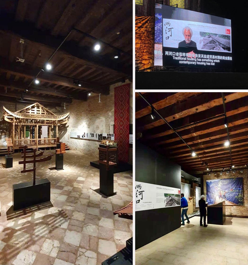 In 2019, with the support of the Fondazione EMGdotART, professors and students from Southeast University, Huazhong University of Science and Technology, Chongqing University and Università Iuav di Venezia conducted an on-site investigation in Lianghekou Village, and carried out research and design of its Old Street through the lens of living protection and adaptive renewal (Fig.4.,Fig.5.). The international joint research outcomes became one of the 15 official Collateral Events of the 17th International Architecture Exhibition – La Biennale di Venezia, under the theme of LIANGHEKOU, a Tujia Village of Re-Living-Together (Fig.6.). After the exhibition, all the exhibits returned to the original site of Lianghekou Village, Xuan'en County. The curatorial team has further expanded the content, and planned to set up as a permanent on-site exhibition that showcases the heritage value of Asian Gan-lan architecture with the theme of WULING GAN-LAN, Splendid Archi-tectonic Legacy of Asian Wooden Architecture. The opening ceremony of the exhibition will be held concurrently with the International Symposium on Conservation and Regeneration of Asian Gan-lan Wooden Architectural Heritage.