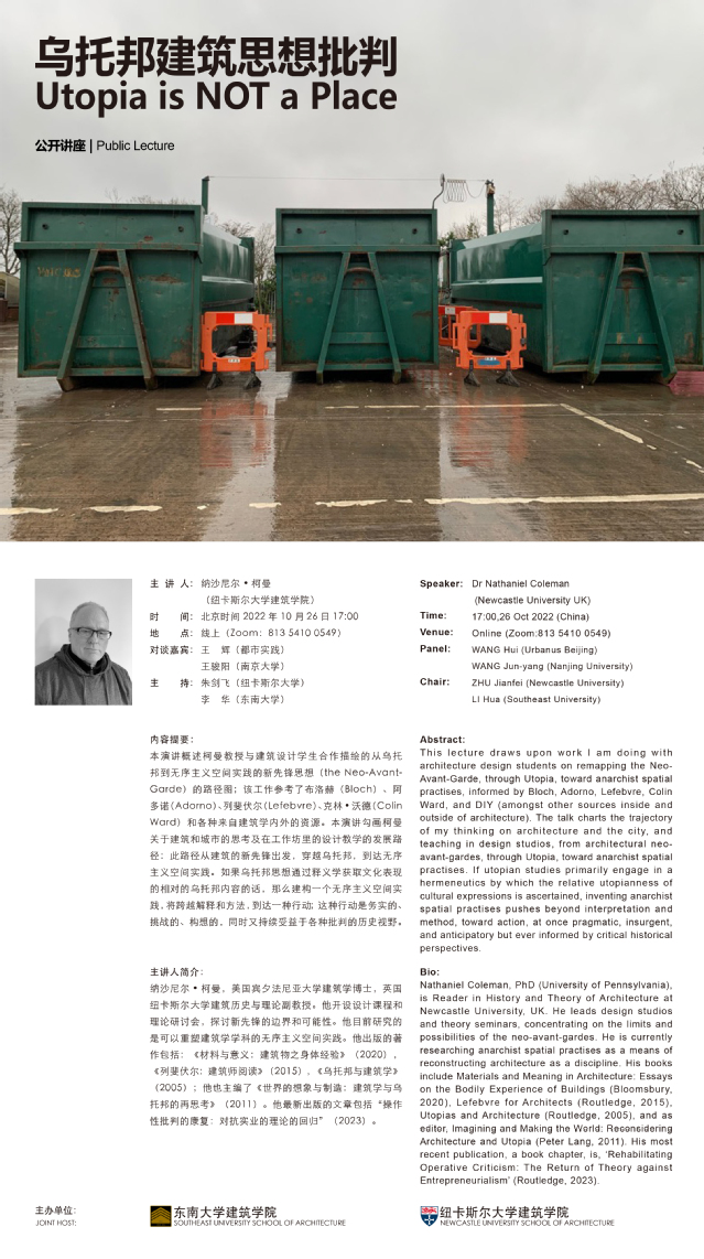 本演讲概述柯曼教授与建筑设计学生合作描绘的从乌托邦到无序主义空间实践的新先锋思想(the Neo-Avant-Garde)的路径图;该工作参考了布洛赫(Bloch)、阿多诺(Adorno)、列斐伏尔(Lefebvre)、克林·沃德(Colin Ward)和各种来自建筑学内外的资源。本演讲勾画柯曼关于建筑和城市的思考及在工作坊里的设计教学的发展路径:此路径从建筑的新先锋出发,穿越乌托邦,到达无序主义空间实践。如果乌托邦思想通过释义学获取文化表现的相对的乌托邦内容的话,那么建构一个无序主义空间实践,将跨越解释和方法,到达一种行动;这种行动是务实的、挑战的、构想的,同时又持续受益于各种批判的历史视野。