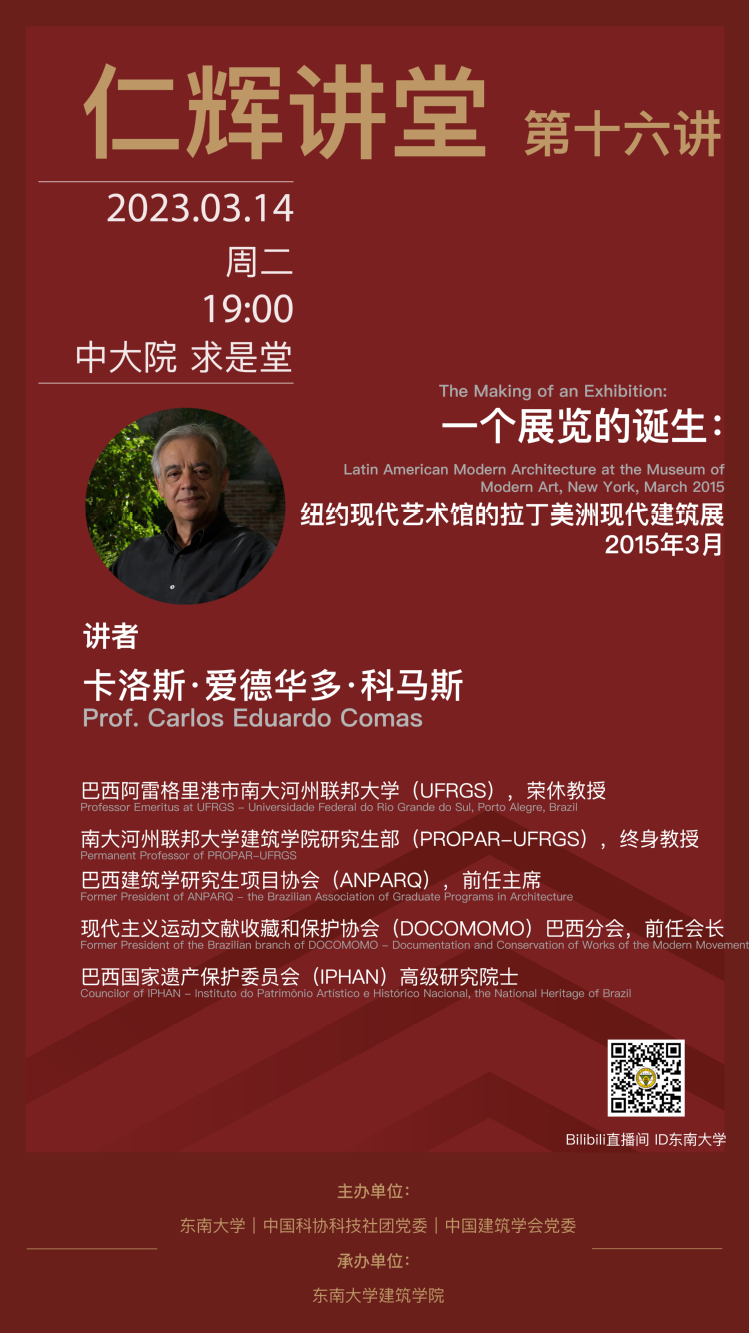 开设“仁辉讲堂”,长期延请国内外著名学者、建筑师举办讲座,弘扬学术,激励后学,推动中国建筑和建筑教育事业的蓬勃发展。本期为仁辉讲堂第十六讲,由巴西的卡洛斯·爱德华多·科马斯教授主讲,采取线上线下同步直播的方式开展。本期以英语为讲座语言,提供总结性汉语翻译。The year 2021 marks the 120th anniversary of the birth of Prof. Yang Tingbao, the greatest architect of the 20th century in China and a renowned educator who, along with others, laid the foundation for the architecture program of Southeast University. In Chinese tradition, Prof. Yang Tingbao is also known as Renhui, which serves as his alternative given name. To continue and carry forward his academic spirit, the School of Architecture of Southeast University found a Forum named after Renhui in 2021,which allows for repeatedly inviting renowned scholars and architects from China and abroad to share their ideas and expertise with younger generations, enriching academic life and contributing to the development of architectural practice and education in China. The upcoming lecture is the 16th of the Renhui Forum and will be delivered by distinguished professor Carlos Eduardo Comas from Brazil, both at the venue and via livestream.