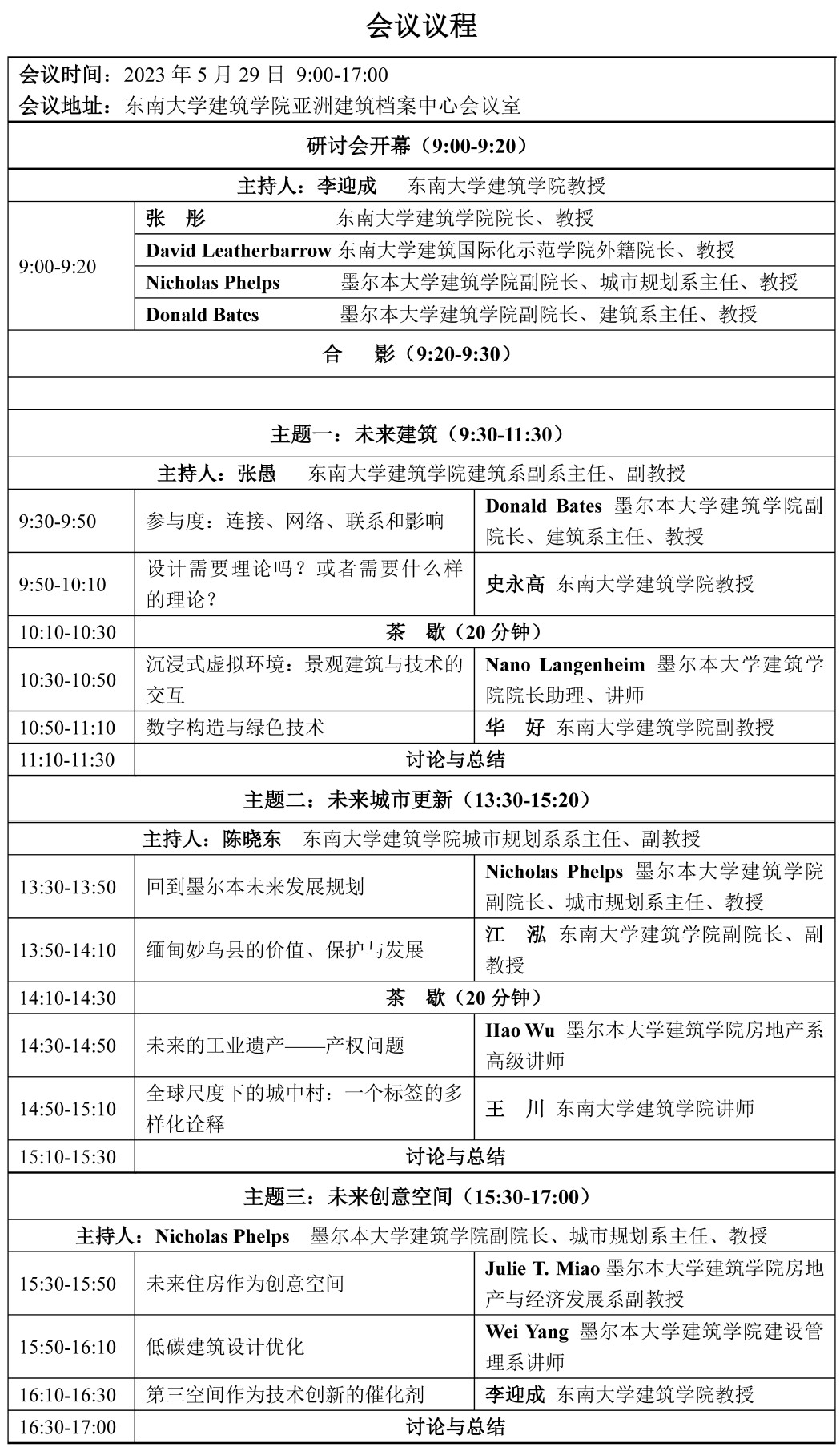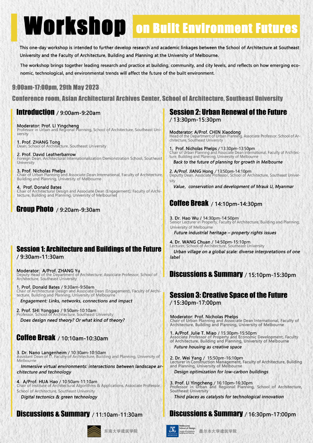 This workshop, themed Built Environment Futures, is jointly organized by the School of Architecture at Southeast University and the Faculty of Architecture, Building and Planning at the University of Melbourne. Experts from the two schools are invited to conduct discussions on this theme. The purpose of this workshop is to discuss the multiple forms and coping strategies of the future built environment under the background of urban sustainable development in different dimensions such as architecture, community and city and from the perspectives of economy, technology and environment. This workshop is also intended to further strengthen the academic exchanges and cooperation between the School of Architecture at Southeast University and the Faculty of Architecture, Building and Planning at the University of Melbourne.