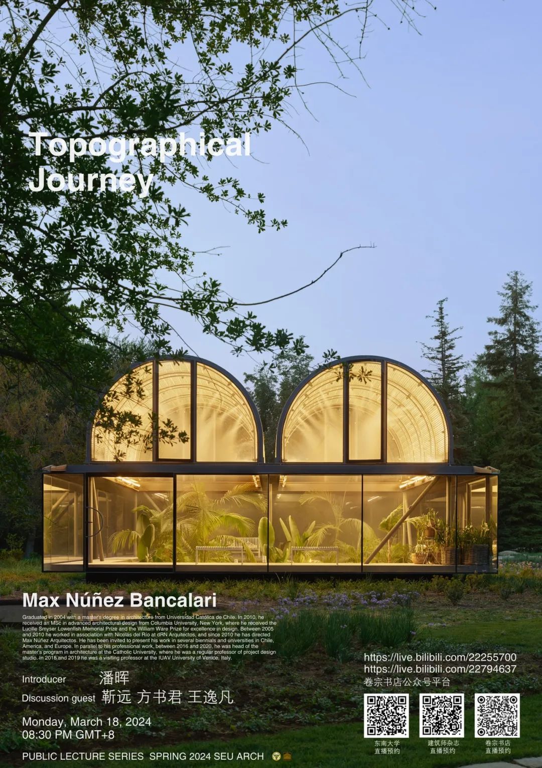 Max Núñez Bancalari于2004年毕业于智利天主教大学,获得建筑师和建筑学硕士学位;于2010年获得纽约哥伦比亚大学高级建筑设计硕士学位,并在学生期间获得了Lucille Smyser Lowenfish纪念奖和William Ware卓越设计奖。2005年到2010年,他在dRN 与Nicolás del Río合作,并于2010年成立了Max Núñez Arquitectos。他曾受邀在智利、美国和欧洲的各种双年展和大学展示他的作品。执业同时,他于2016年至2020年间担任智利天主教大学建筑学硕士项目的负责人和工作室教授;2018年至2019年担任意大利威尼斯IUAV大学的客座教授。