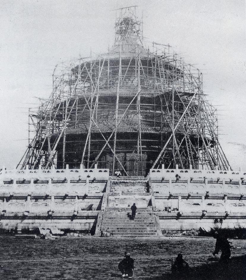 天坛祈年殿修缮现场(来源:王建国主编.杨廷宝建筑论述与作品选集.北京:中国建筑工业出版社,1997:20)